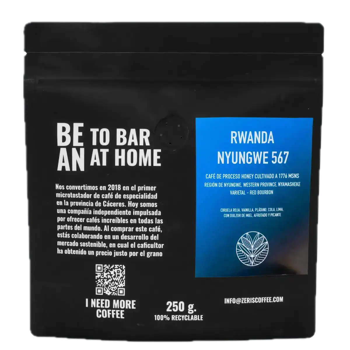 Café de variedad Arábica de proceso honey. De la región de Nyamasheke. Ciruela roja, vainilla, plátano, cola, lima, dulzor de miel, afrutado y picante.